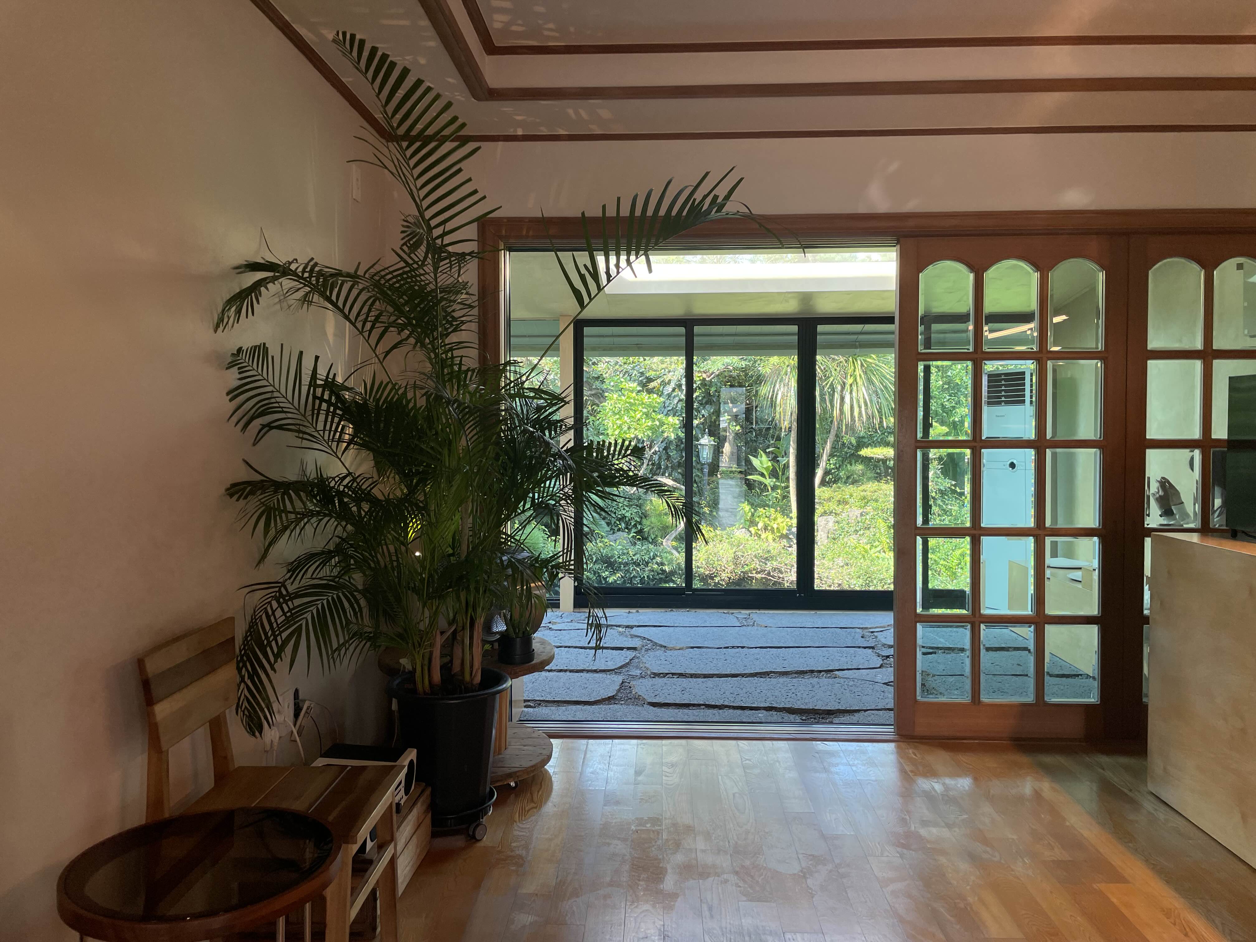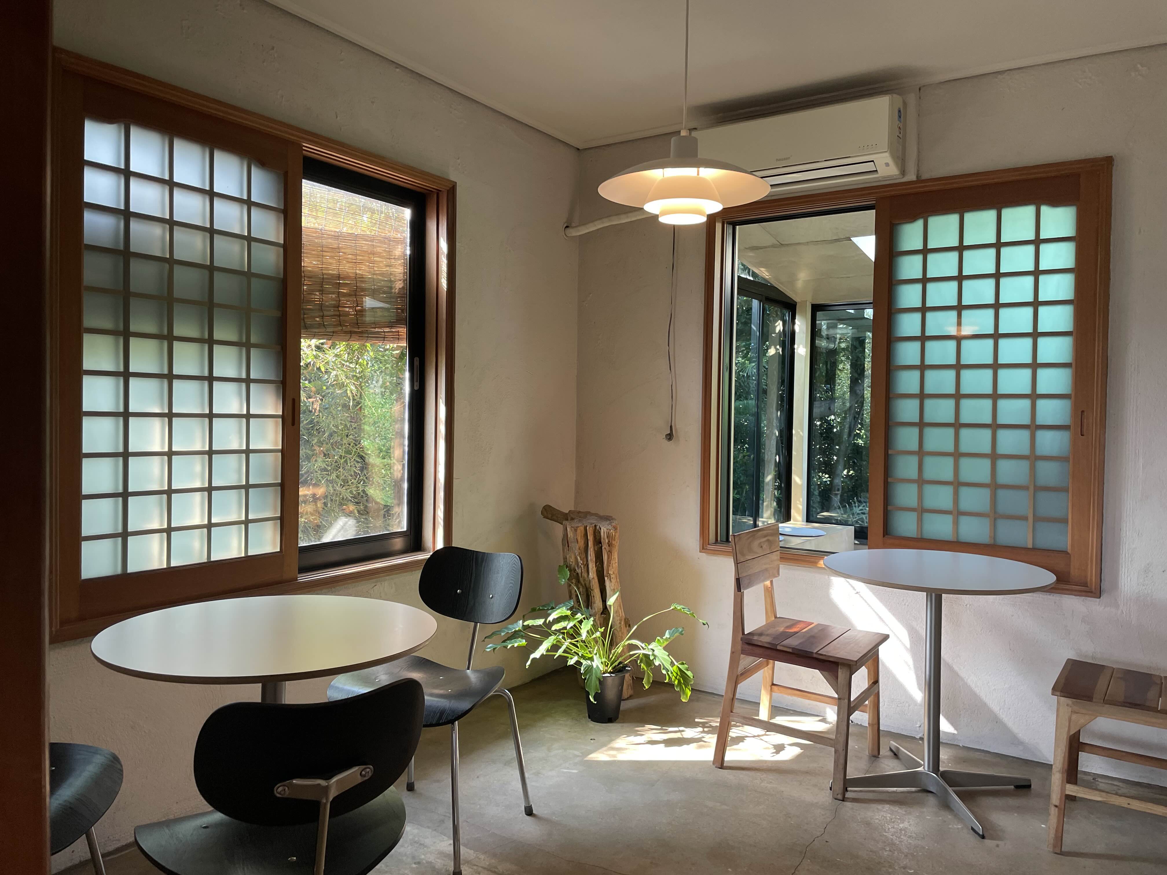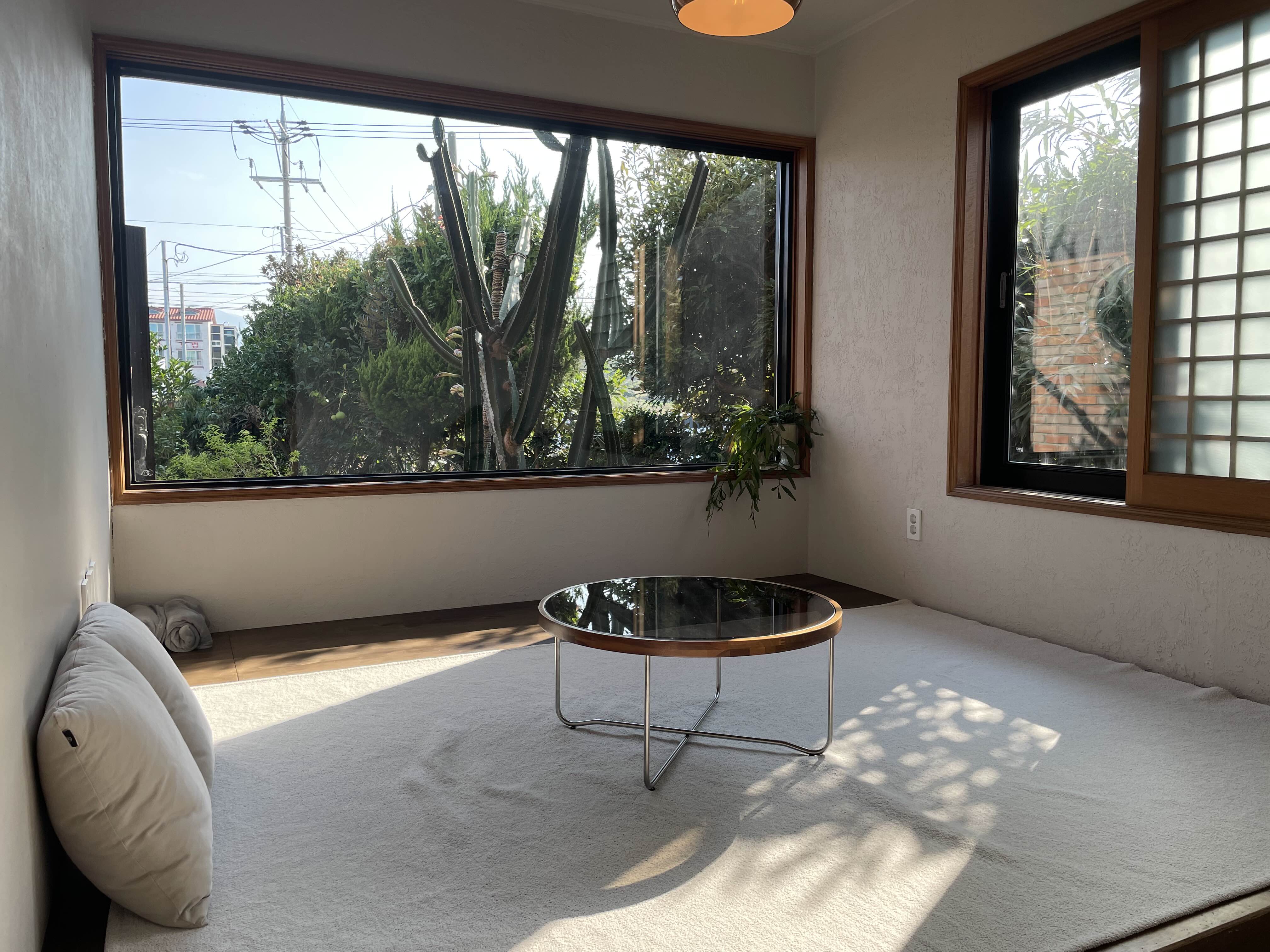 인테리어와 초록 초록한 통유리창이